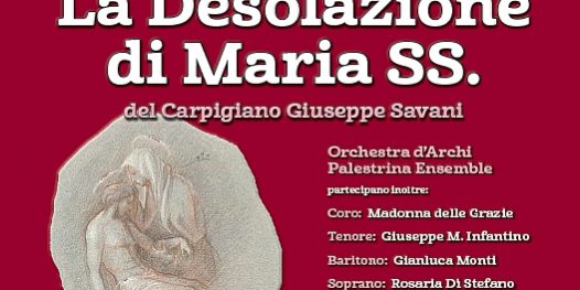 La “Desolazione di Maria Santissima”, concerto vocale e strumentale del Sabato Santo, a cura della Corale G.P. da Palestrina di Carpi. Un concerto molto particolare e tipicamente carpigiano; per questo motivo, ora che la fine (speriamo) della pandemia ci ridona la possibilità di gustare buona musica dal vivo, abbiamo deliberato di contribuire alla sponsorizzazione dell’evento, congiuntamente ad altri Enti e al Comune di Carpi.